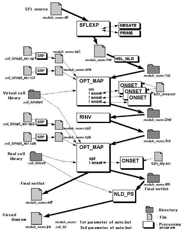 Furthermore, another script file, module_name.ons, is called by module_name.op1 and executed. This module_name.ons is also generated from a template file, opt_scr.lv3, in the cell library. OPT_MAP executes module_name.ons. The latter repeatedly activates the logic circuit simplification program, ONSET. Clearly redundant parts are thus removed from the circuit, and the logic combinational circuit parts are simplified. The resulting netlist from OPT_MAP is stored in NLD format in a sub-directory, module_name.2nd.