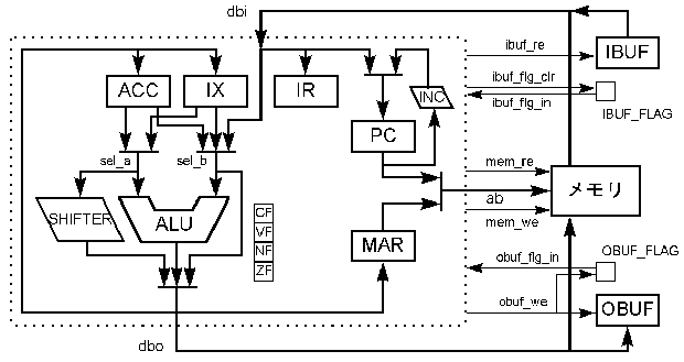 dbiはメモリやIBUF(入力用バッファ)の内容を読み込むための入力データ バスです.また,dboはメモリやOBUF(出力用バッファ)にデータを書き込む ための出力データバスです.これらは共に8ビットの幅を持ちます.