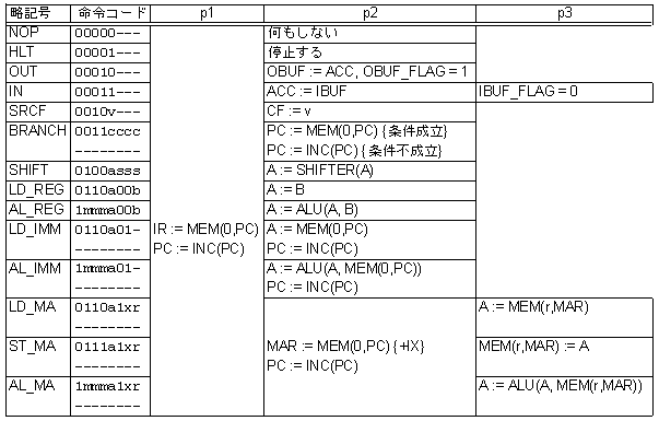[表 1.1] フェーズ表NOP, HLT, OUT, IN命令はそれぞれ独自のものとして分類します.RCF, SCF 命令は1つにまとめてSRCFとします.Bcc命令は条件によって様々なものがあり ますが,これらをすべて1つにまとめてBRANCHとします.Ssm命令とRsm命令も すべてを1つにまとめてSHIFTとします.