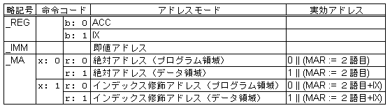 LD, ST命令は,アドレスの指定方法により,LD_REG, LD_IMM, LD_MA, ST_MAと細分化して考えます.ここで,_REGはレジスタ指定(register),_IMM は即値指定(immediate),_MAは絶対アドレスとインデックス修飾アドレス指定 (memory address)を表します.